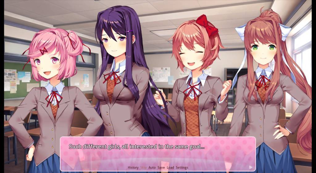 Sayori, the youthful bundle of sunshine who values happiness the most; Natsuki, the deceivingly cute girl who packs an assertive punch; Yuri, the timid and mysterious one who finds comfort in the world of books; ...And, of course, Monika, the leader of the club! That's me!